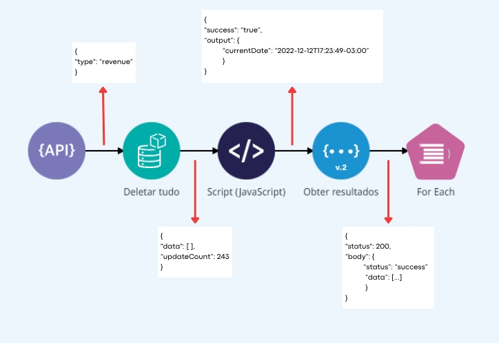 Um pipeline é construído usando um REST Trigger, que é solicitado e passa o parâmetro recebido ("type": "revenue") para o próximo componente - um Object Store chamado “Deletar tudo”. Um componente após o outro finaliza sua execução e aciona o próximo entregando a mensagem resultante do seu processamento.