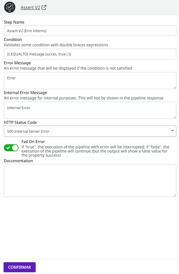O atributo **Fail On Error** indica que a execução do fluxo do *pipeline* será interrompida e será lançada uma exceção caso a condição do componente *Assert* não for validada.
