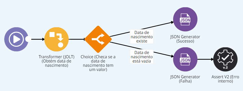 Caso o atributo “Data de Nascimento” esteja vazio, o componente **JSON Generator (Falha)** retorna o atributo com valor `“false”`: