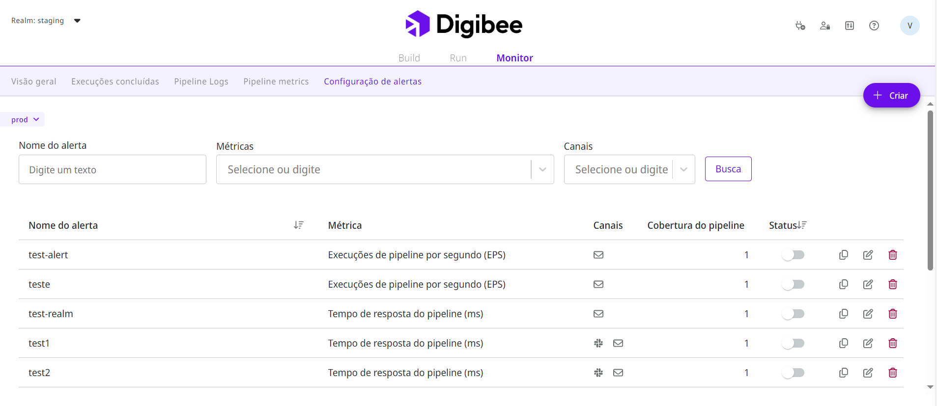 Métricas de alerta ajudam você a garantir a confiabilidade e o desempenho dos seus pipelines. Confira a [documentação de Métricas de alerta](https://docs.digibee.com/documentation/developer-guide/pt-br/development-cycle/dashboards/alerts/available-metrics) para visualizar as métricas de pipeline que você pode usar para configurar alertas.