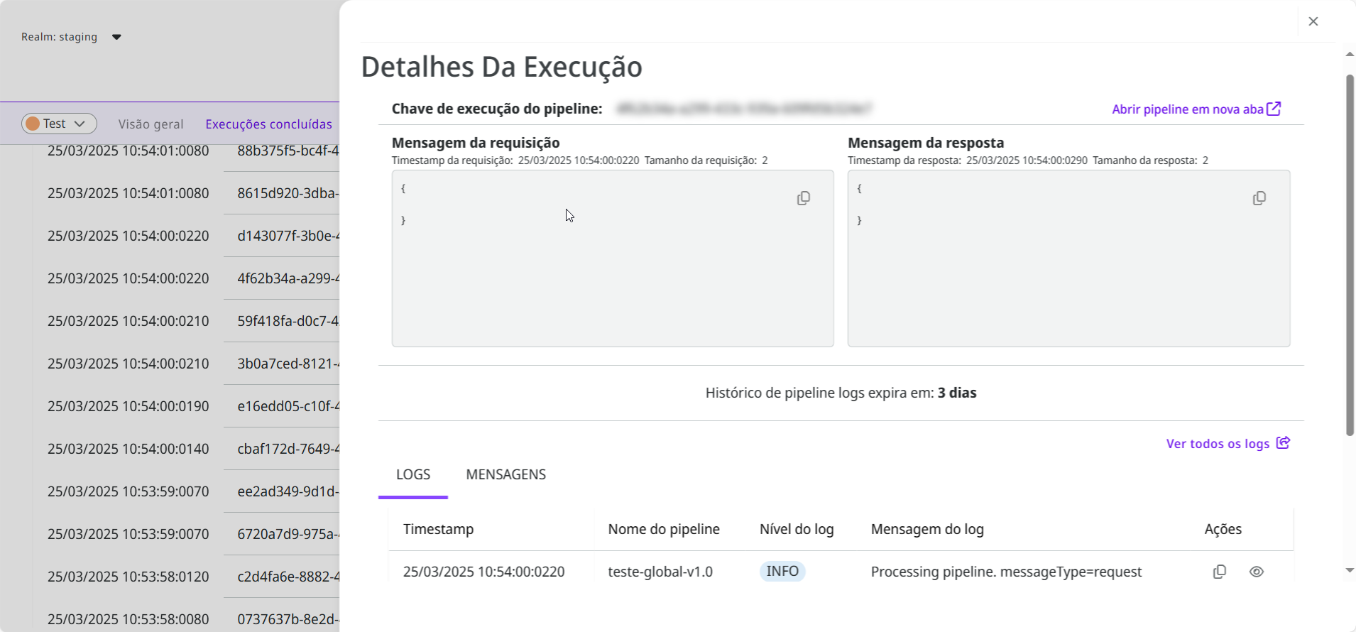 Logs de execução: Os logs do pipeline gerados durante a execução. Clique no ícone de olho para visualizar a mensagem do log. Nesta tela, você pode copiar a mensagem ou formatar o JSON.