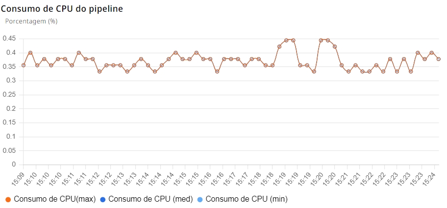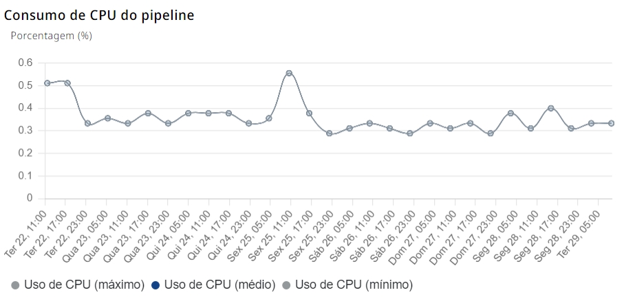 Este gráfico mostra o percentual de uso mínimo, médio e máximo de CPU para cada réplica do pipeline, com base no tamanho de implantação escolhido. Com essas informações, você pode determinar se o tamanho do pipeline selecionado durante sua implantação foi apropriado ou não, pois o uso maior da CPU pode levar a um processamento mais lento.