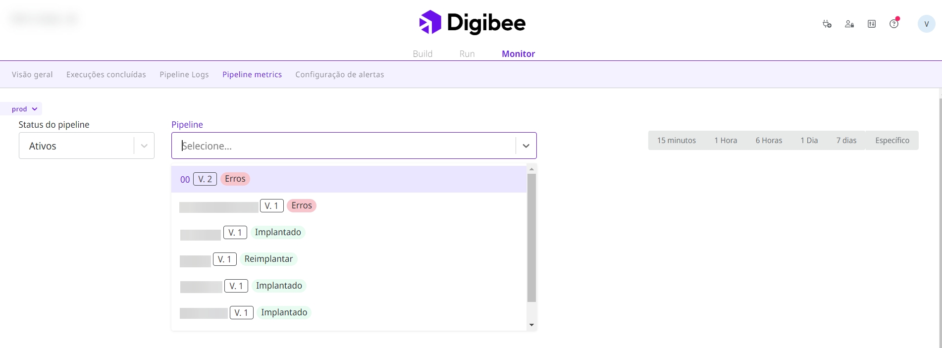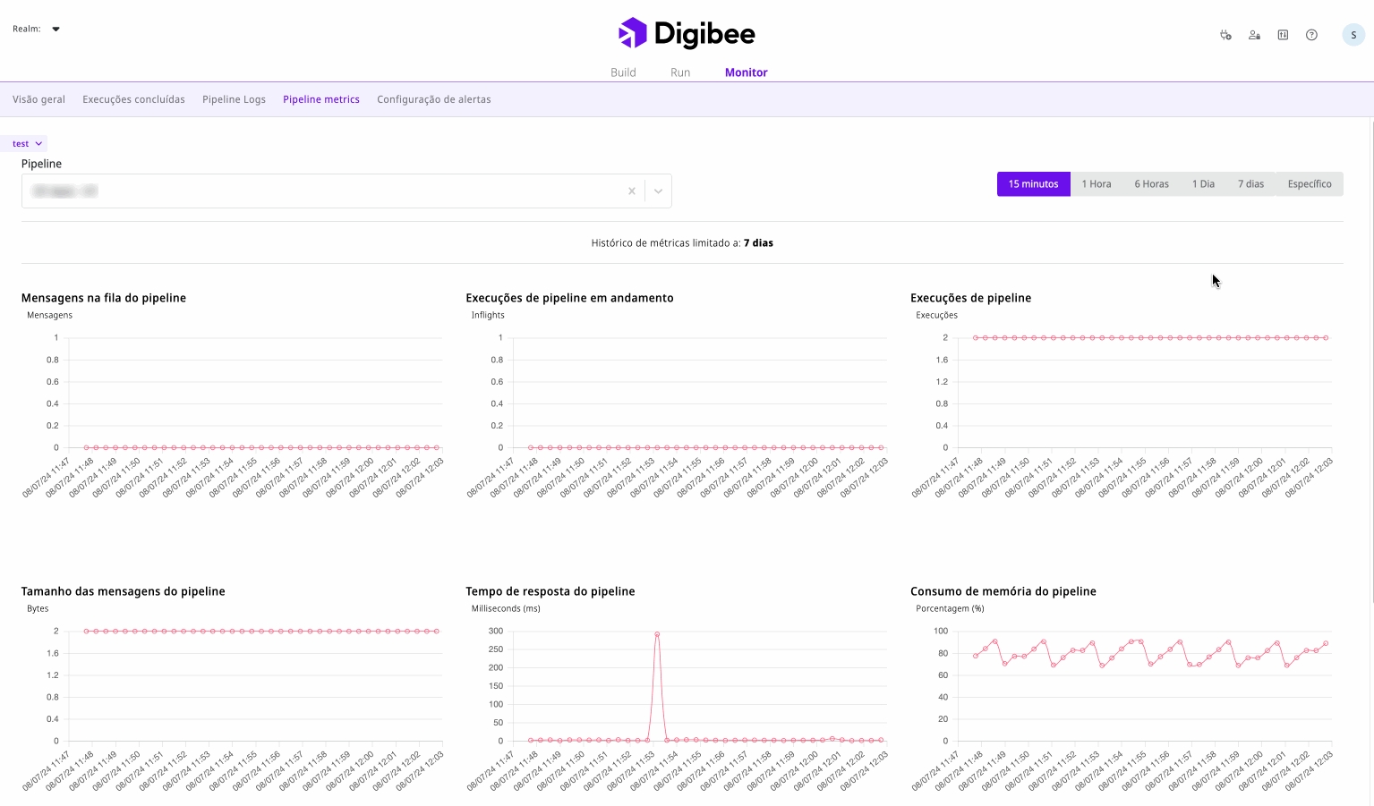 Ao selecionar um pipeline, a Plataforma exibe o filtro de 15 minutos por padrão. Você pode alterar o período do relatório escolhendo entre intervalos de 15 minutos, 1 hora, 6 horas, 1 dia e 7 dias ou definir um intervalo de tempo específico conforme desejado.