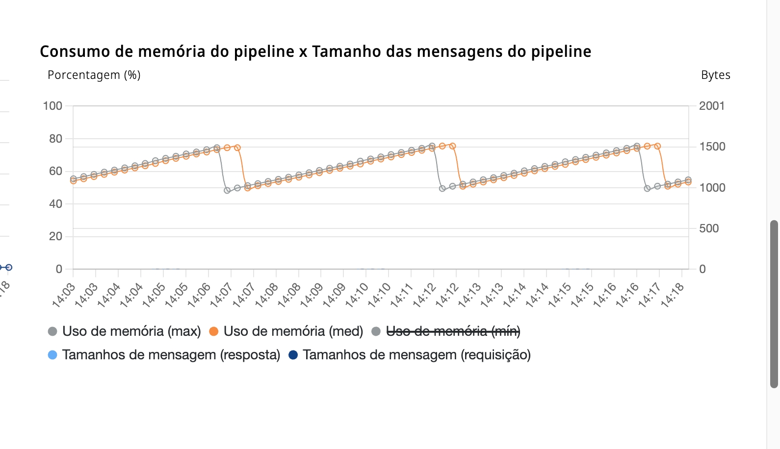 Este gráfico ilustra o uso mínimo, médio e máximo de memória do pipeline em relação aos tamanhos das mensagens de solicitação e resposta.