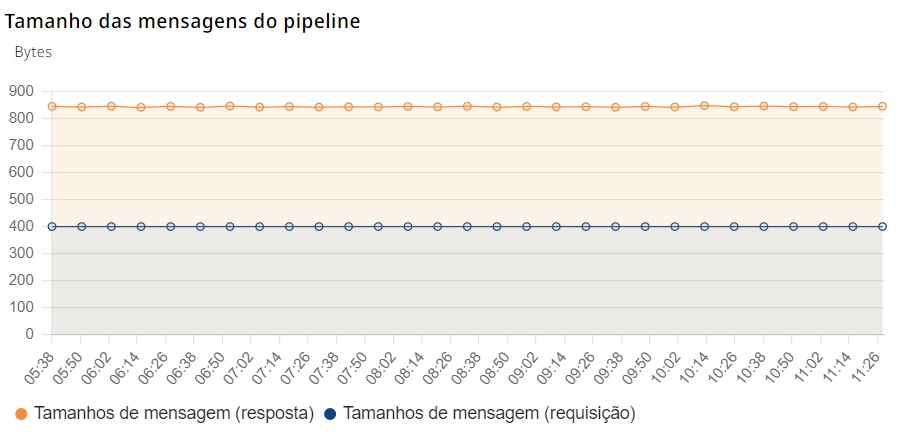 Este gráfico ilustra o tamanho médio das mensagens de solicitação e resposta ao longo do tempo, em bytes. Ele ajuda você a verificar se o tamanho do pipeline (memória) é apropriado para a implantação.