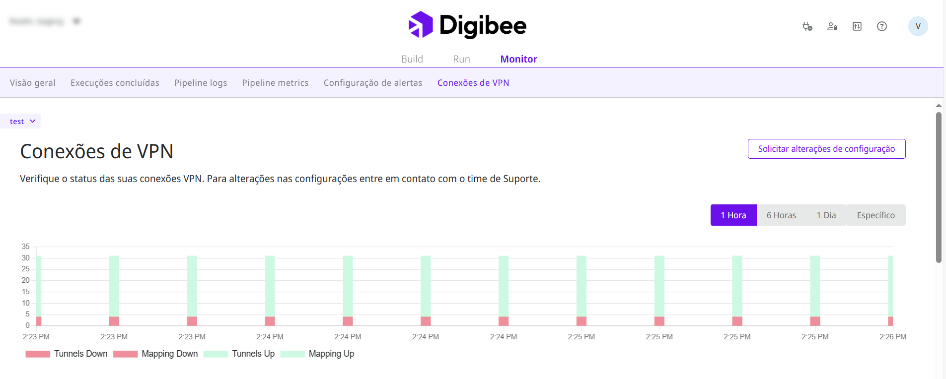 No canto superior direito da página, você encontrará o botão **Solicitar alterações de configuração**. Clique nele para abrir uma solicitação de chat com o time de suporte da Digibee para alterar sua configuração de VPN.