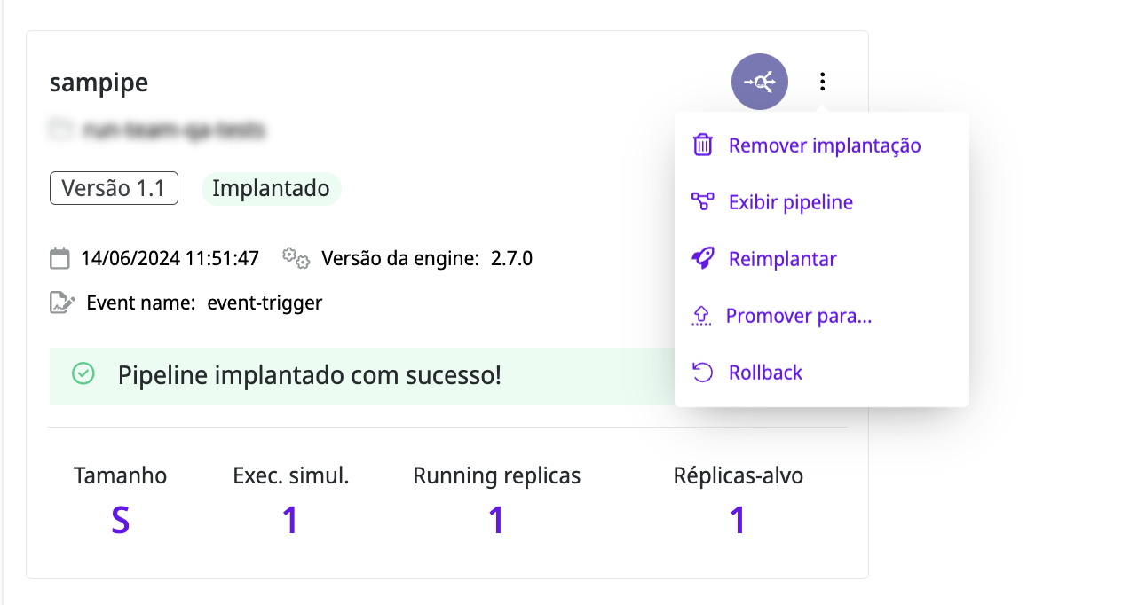 * **Reimplantar:** para fazer a implantação do mesmo *pipeline*, mas alterando suas configurações. [Para saber mais sobre como reimplantar um pipeline, leia este artigo.](https://docs.digibee.com/documentation/developer-guide/pt-br/development-cycle/overview/deployment/deployments)