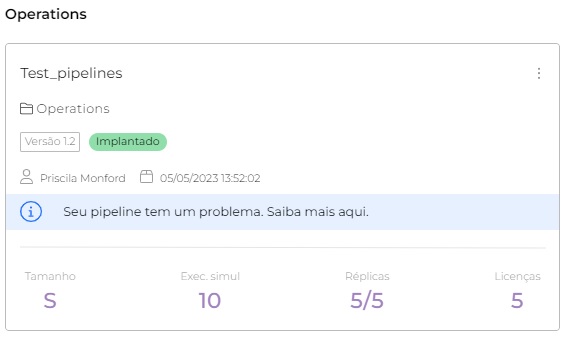 Quando ocorre algum possível problema no pipeline, um aviso é exibido no card do pipeline no formato mostrado abaixo: