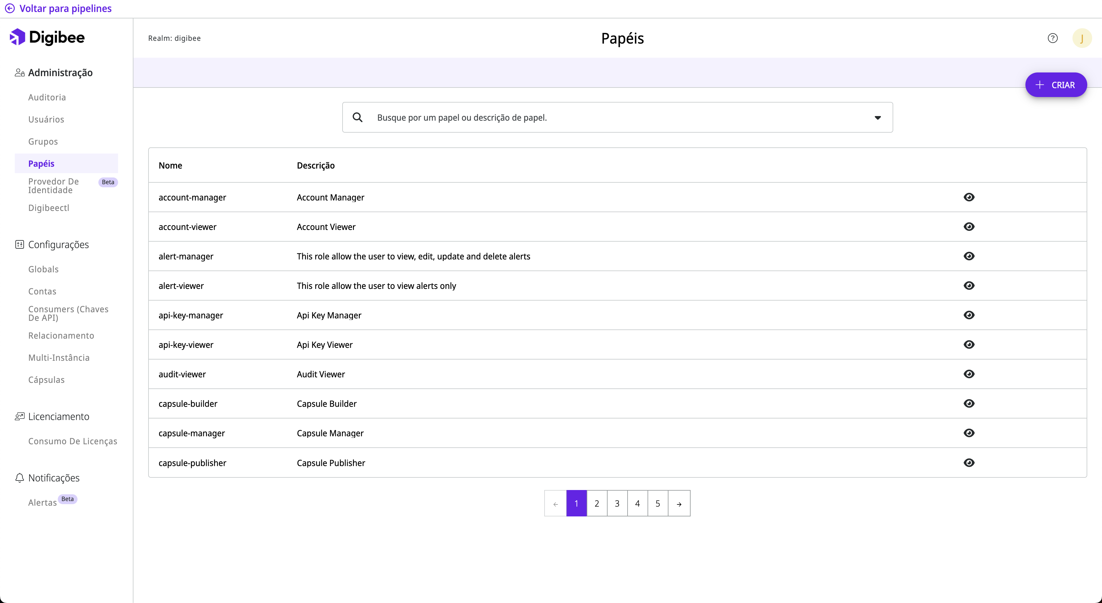 Esta tabela mostra o **nome** e **descrição** do papel, assim como botões para visualizá-los, editá-los ou removê-los.