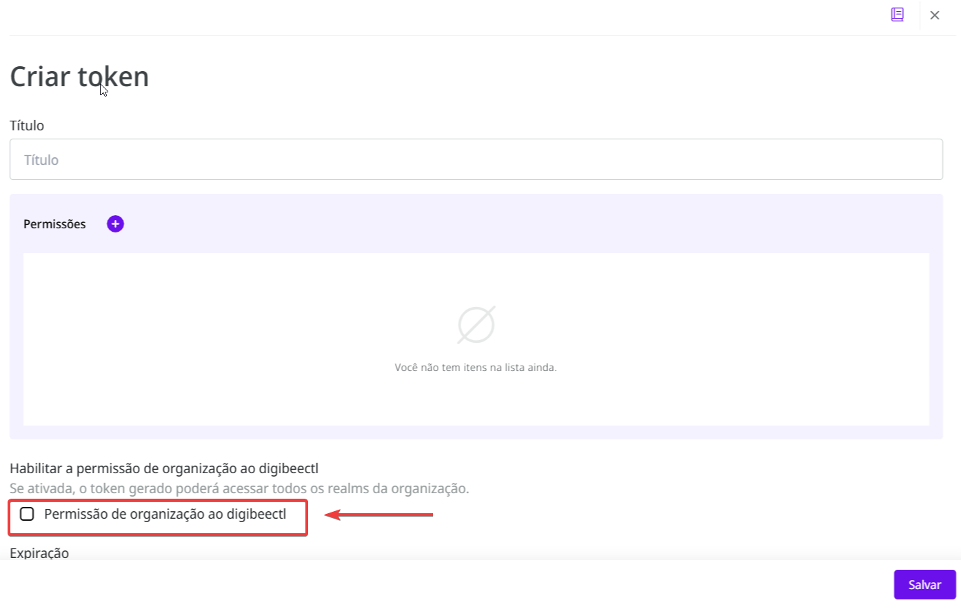 5. Para permitir que o novo token tenha acesso a todos os realms da organização, marque a opção **Permissão de organização ao digibeectl**