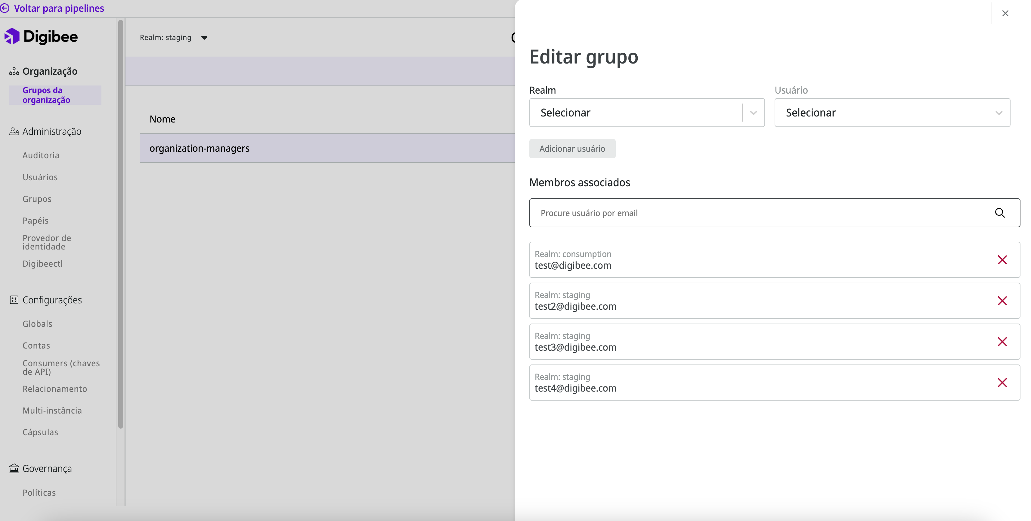 Usuários com a permissão **`ORG:MANAGER`** terão acesso à tela de gestão de organização. Nesta página, eles podem adicionar outros usuários aos grupos de organização, permitindo que os novos usuários adicionados naveguem por qualquer realm da empresa com as permissões de seu realm inicial.