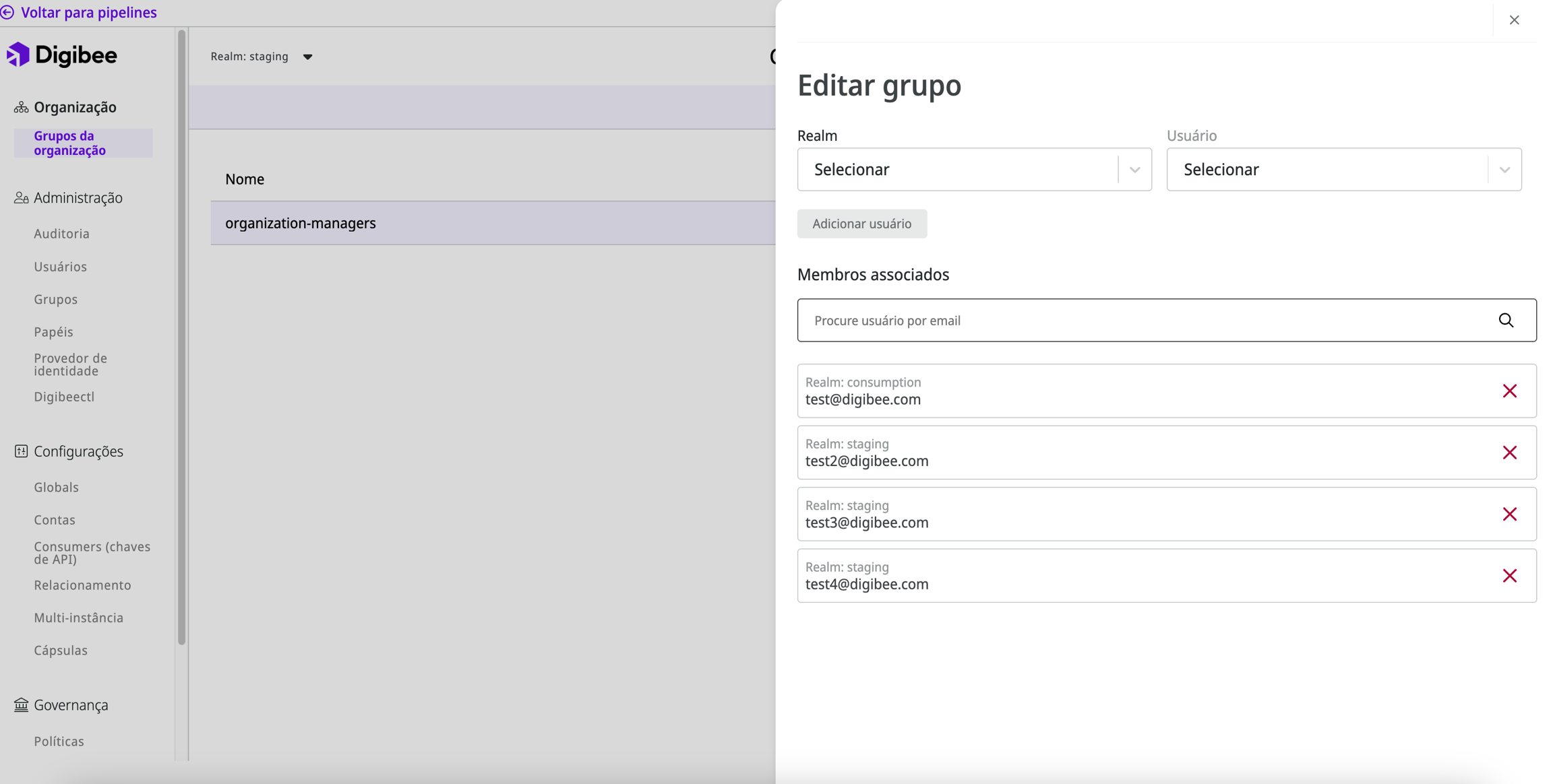 Usuários com a permissão ORG:MANAGER terão acesso à tela de gestão de organização. Nesta página, eles podem adicionar outros usuários aos grupos de organização, permitindo que os novos usuários adicionados naveguem por qualquer realm da empresa com as permissões de seu realm inicial.