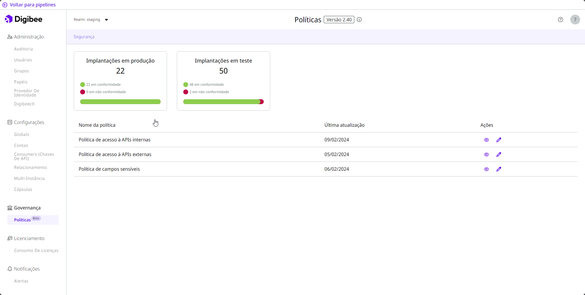 Todos os pipelines implantados devem ser reimplantados para estar em conformidade com a nova versão da Política. Por trabalharmos com contêineres criados e atualizados durante uma implantação, não é possível fazer a atualização automática de políticas.