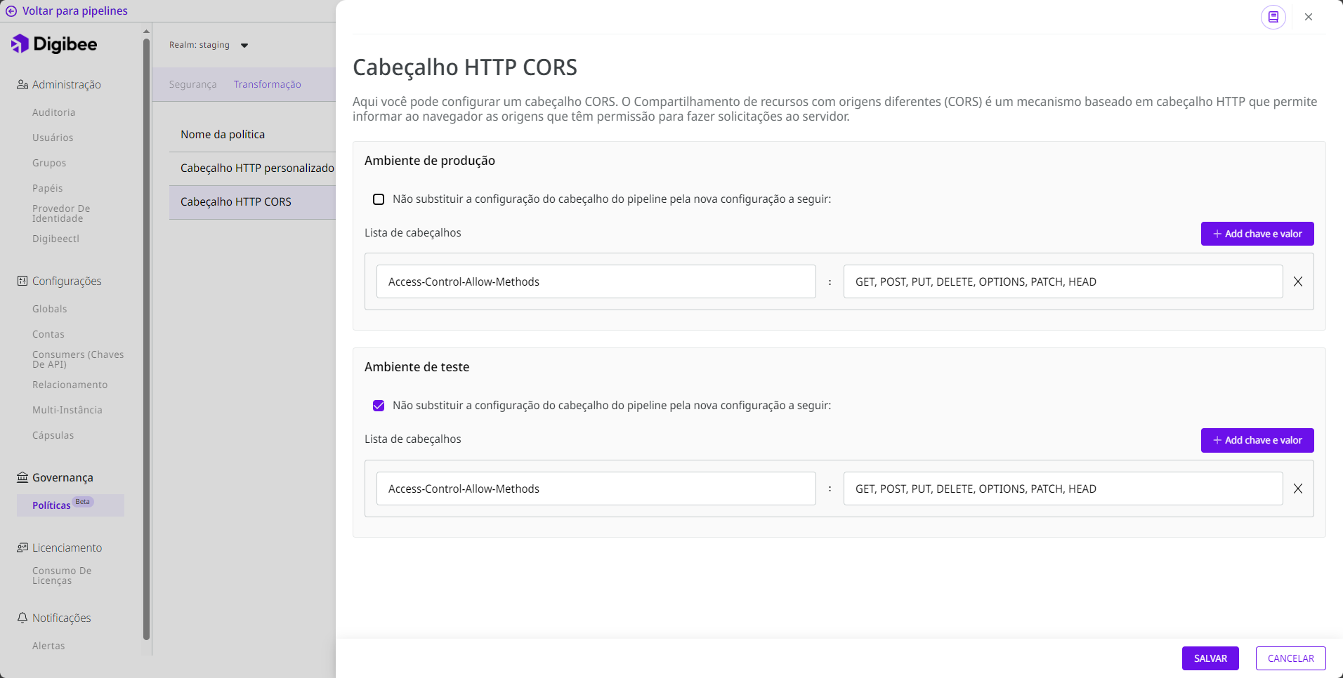 Na Digibee Integration Platform, a política Cabeçalho HTTP CORS permite especificar cabeçalhos para verificar o recurso de origem cruzada com o servidor que o hospeda para ver se a solicitação é permitida. Você também pode definir diferentes pares de chave-valor para cabeçalhos em produção e outros ambientes.