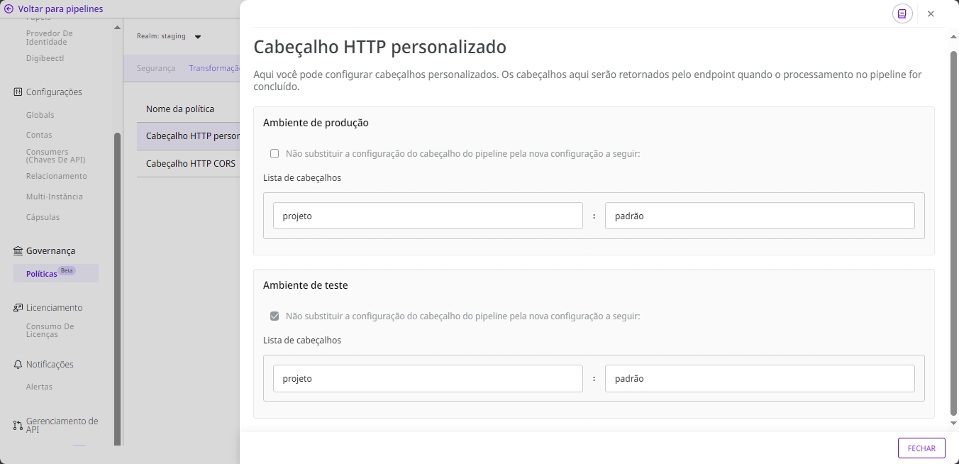 Isto significa que os valores configurados nos pipelines individuais substituirão os valores definidos na política. Então, se você criar um pipeline e adicionar o par chave-valor projeto: digibee, o cabeçalho do pipeline terá precedência sobre o cabeçalho configurado na política. No entanto, se você não adicionar um cabeçalho que contenha a chave projeto no seu pipeline, o cabeçalho projeto: padrão será retornado na resposta em vez disso.