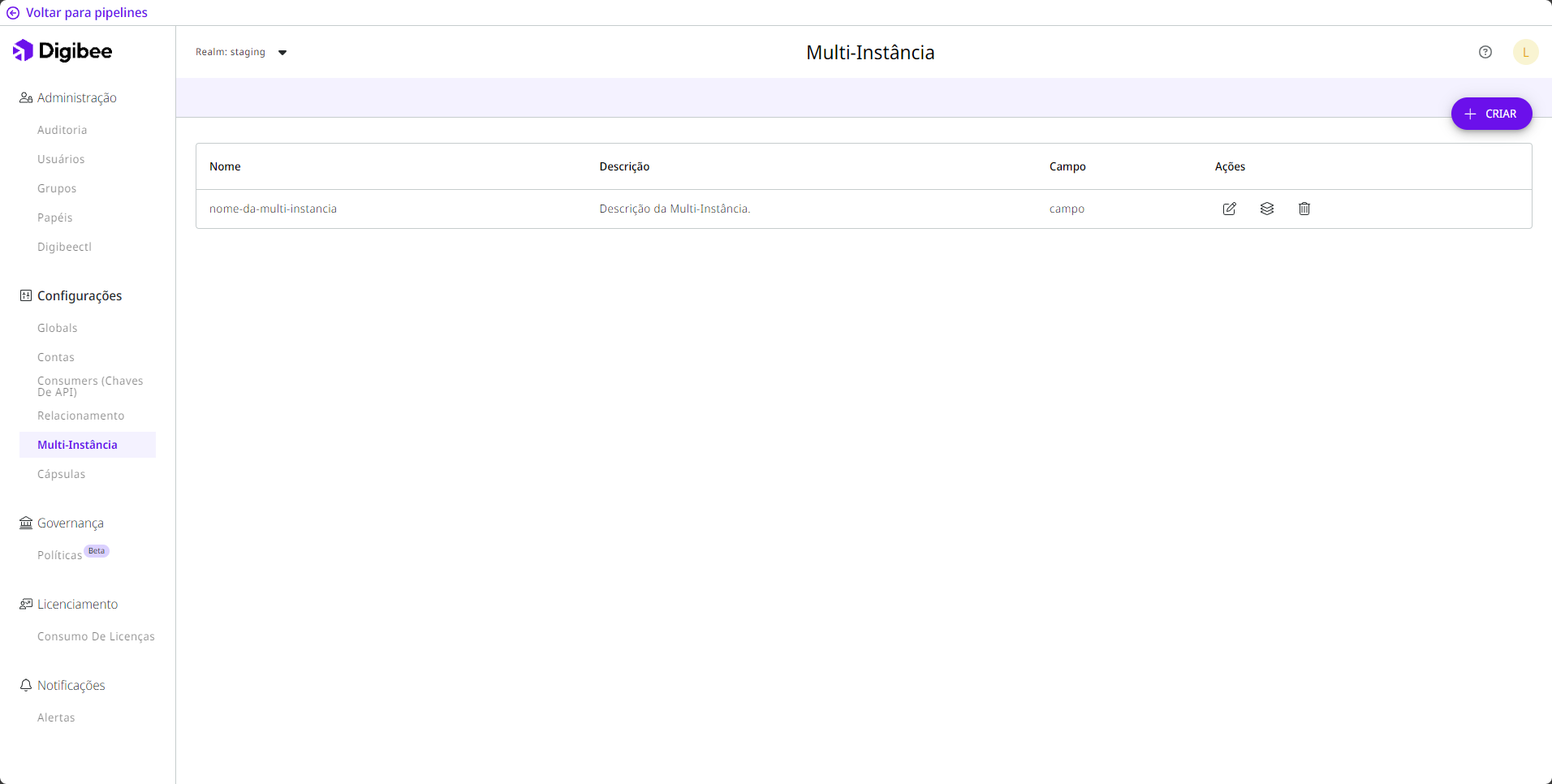 A funcionalidade multi-instância permite a implantação de um mesmo pipeline múltiplas vezes, atendendo a parâmetros diferentes. Desse modo, é possível configurar múltiplas instâncias que processem os dados conforme os parâmetros configurados em cada uma, utilizando o mesmo fluxo de integração.
