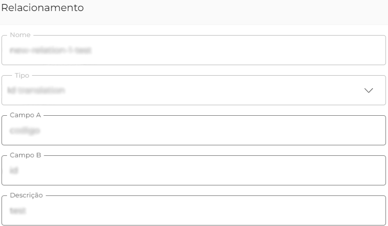 Esta ação permite editar todos os parâmetros de configuração definidos no momento da criação do novo Relacionamento. São eles: Nome, Tipo (ID translation, Parent child, ID translation no overwrite), Campo A, Campo B e Descrição.