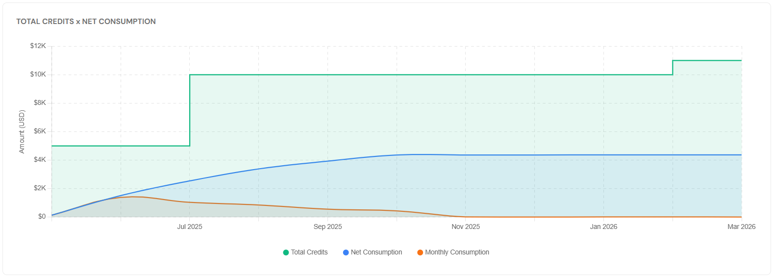 * **Gráfico de uso de créditos:** Exibe a evolução do consumo de créditos ao longo do tempo, incluindo o total de créditos contratados, consumo líquido acumulado e consumo mensal. O mês atual é exibido até o dia anterior.