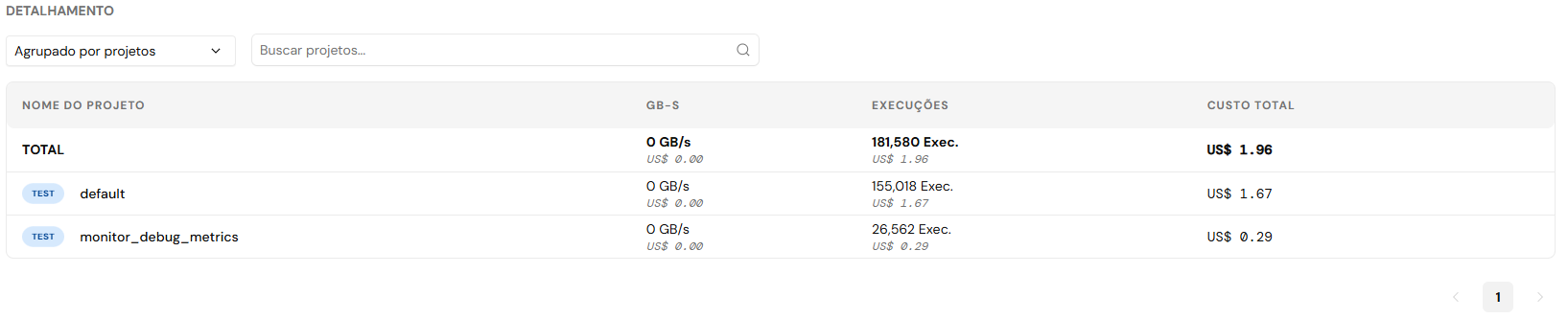 * **Custo total de GB-s:** Custo total e quantidade total de GB-s usados no período selecionado.