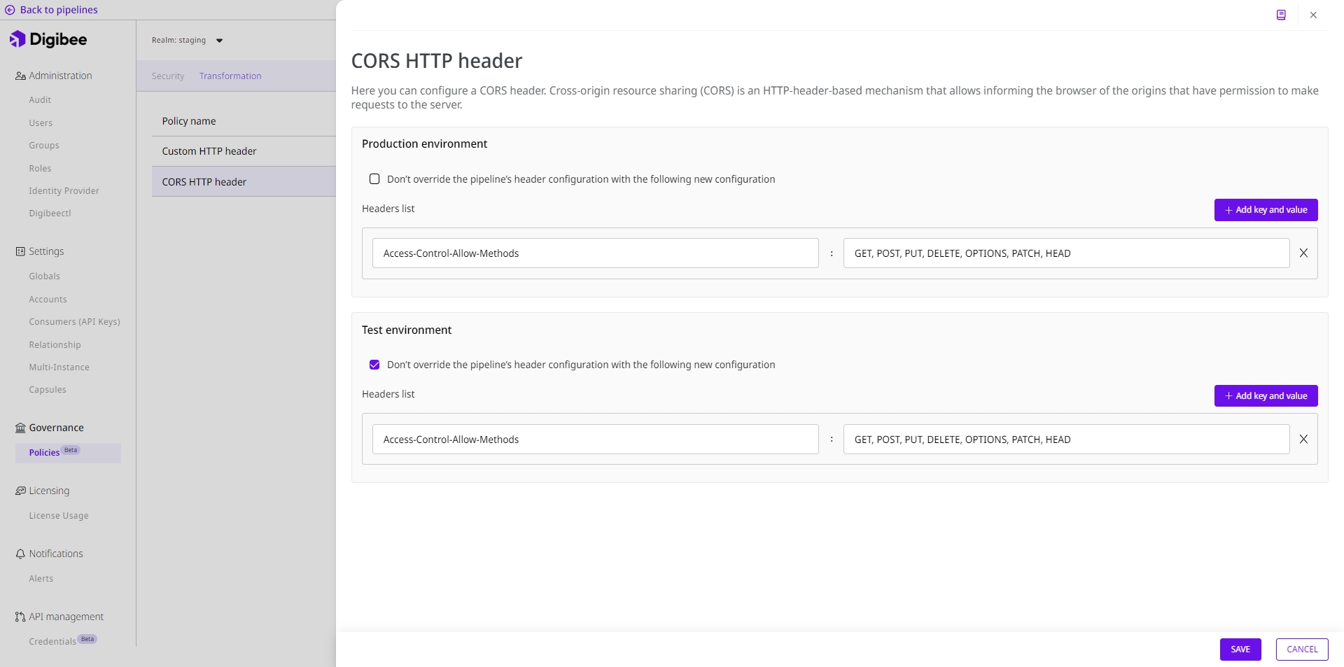 In the Digibee Integration Platform, the CORS HTTP header policy allows you to specify headers to check the cross-origin resource with the server hosting it to see if the request is allowed. You can also define different key-value pairs for headers in production and other environments.