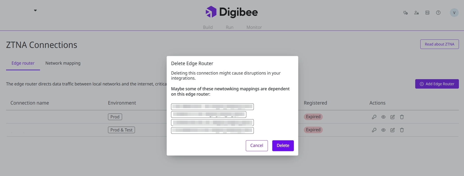 Edge Routers are linked to specific Network Mappings (routes). If you attempt to delete an Edge Router that is the sole link for a Network Mapping, you will receive an alert informing that this action creates an orphaned Network Mapping, which can harm your connections.