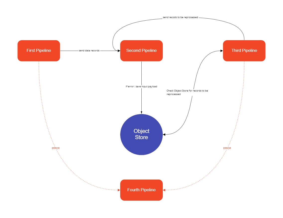 The third pipeline periodically accesses the previously mentioned Object Store and retrieves error records. Then, it checks how many reprocessing attempts occurred for a specific record. If the number of reprocessing attempts has not reached a previously determined limit, the pipeline publishes a reprocessing event that will be received by the second pipeline. If the number of reprocessing attempts has reached the limit or if an error happens during the execution of this pipeline, it publishes an error event.