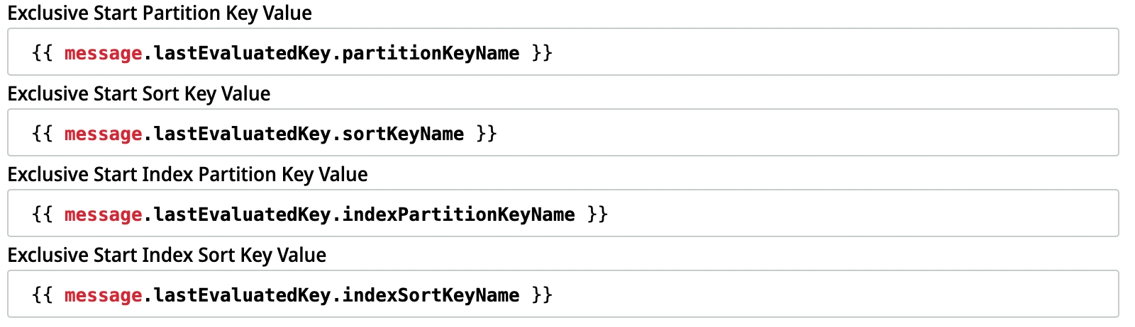 This is how the Exclusive Start Key fields would have to be specified for the following page iteration: