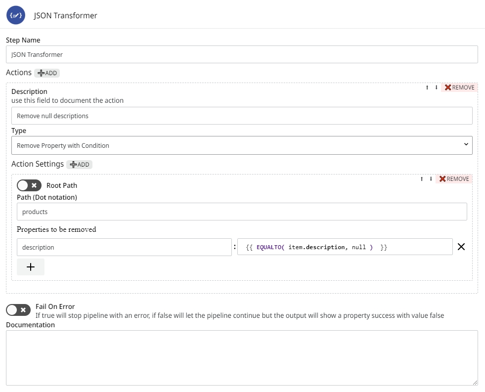 JSON Transformer allows transformations in the JSON being processed in your pipeline. With a configuration form you can perform a variety of actions.