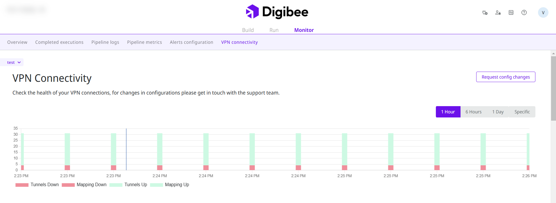 You can now monitor your **VPN connections** directly on the Digibee Integration Platform. This feature allows you to track the status of your **VPN tunnels and mappings** and request changes to the VPN configuration to the Digibee Support Team through the Platform.
