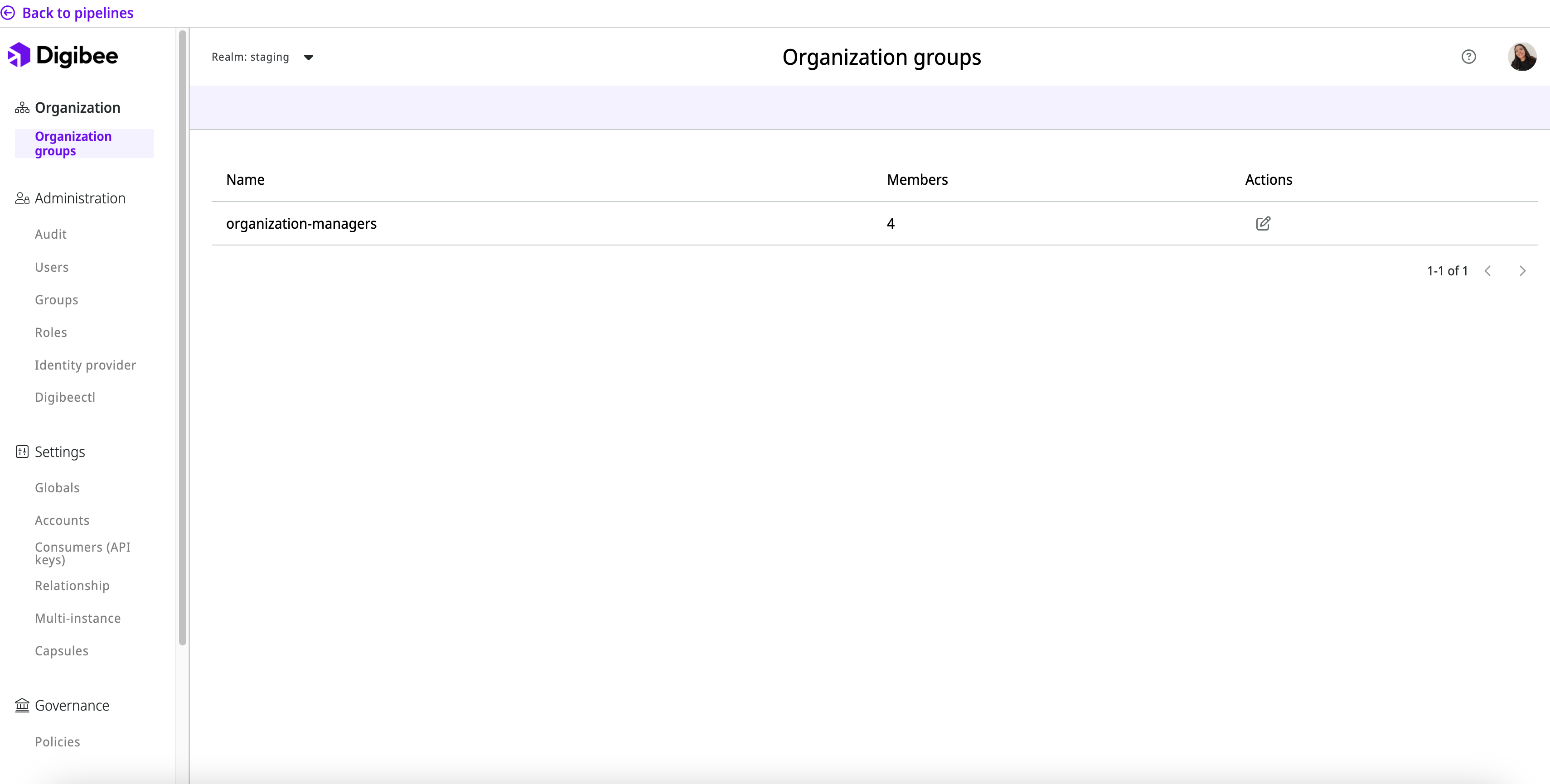 The **Organization groups** feature allows multi-realm customers to manage multiple realms more efficiently. Users with **`ORG:MANAGER`** permission can add and manage members across realms through a dedicated **Organization** section on the Platform.