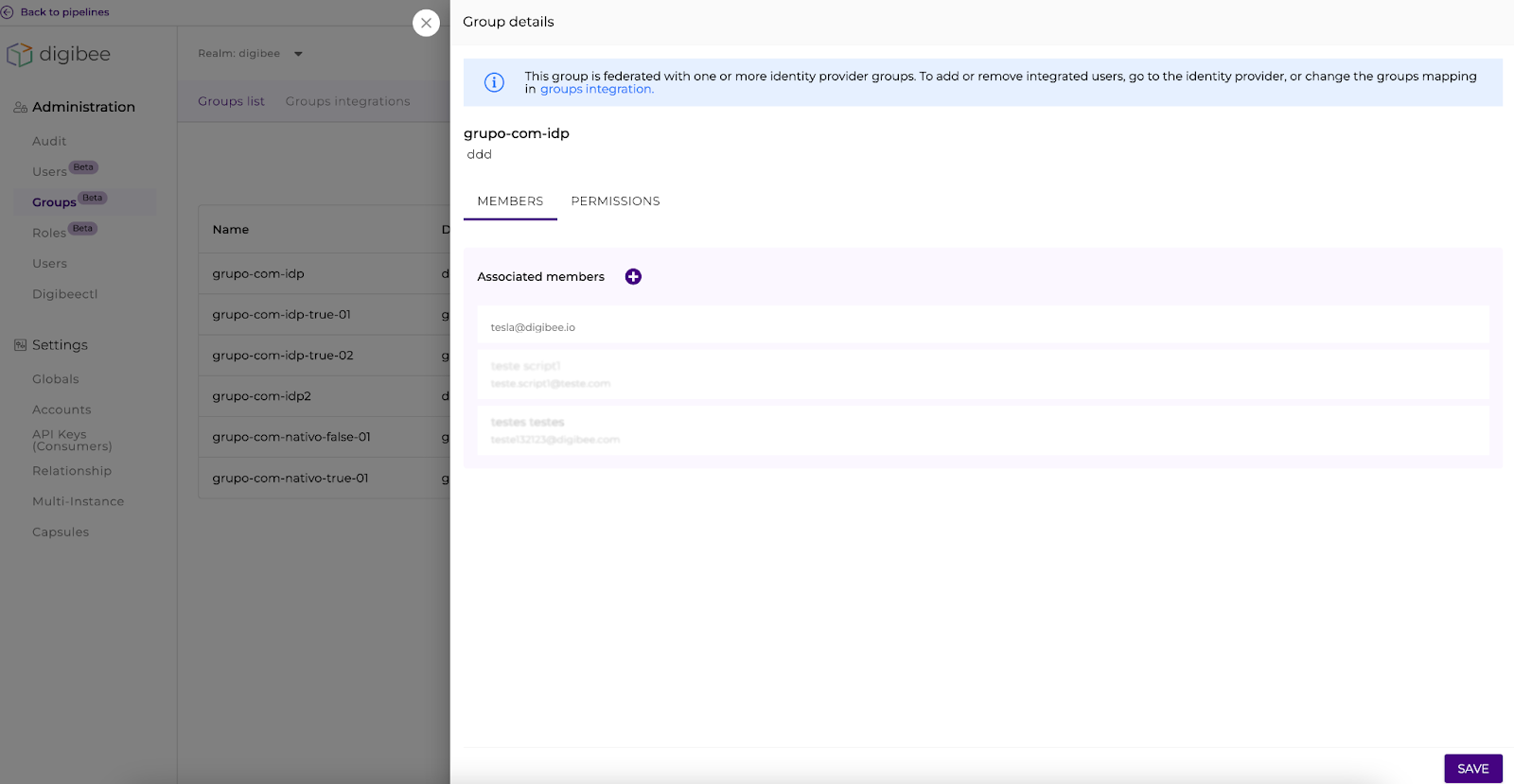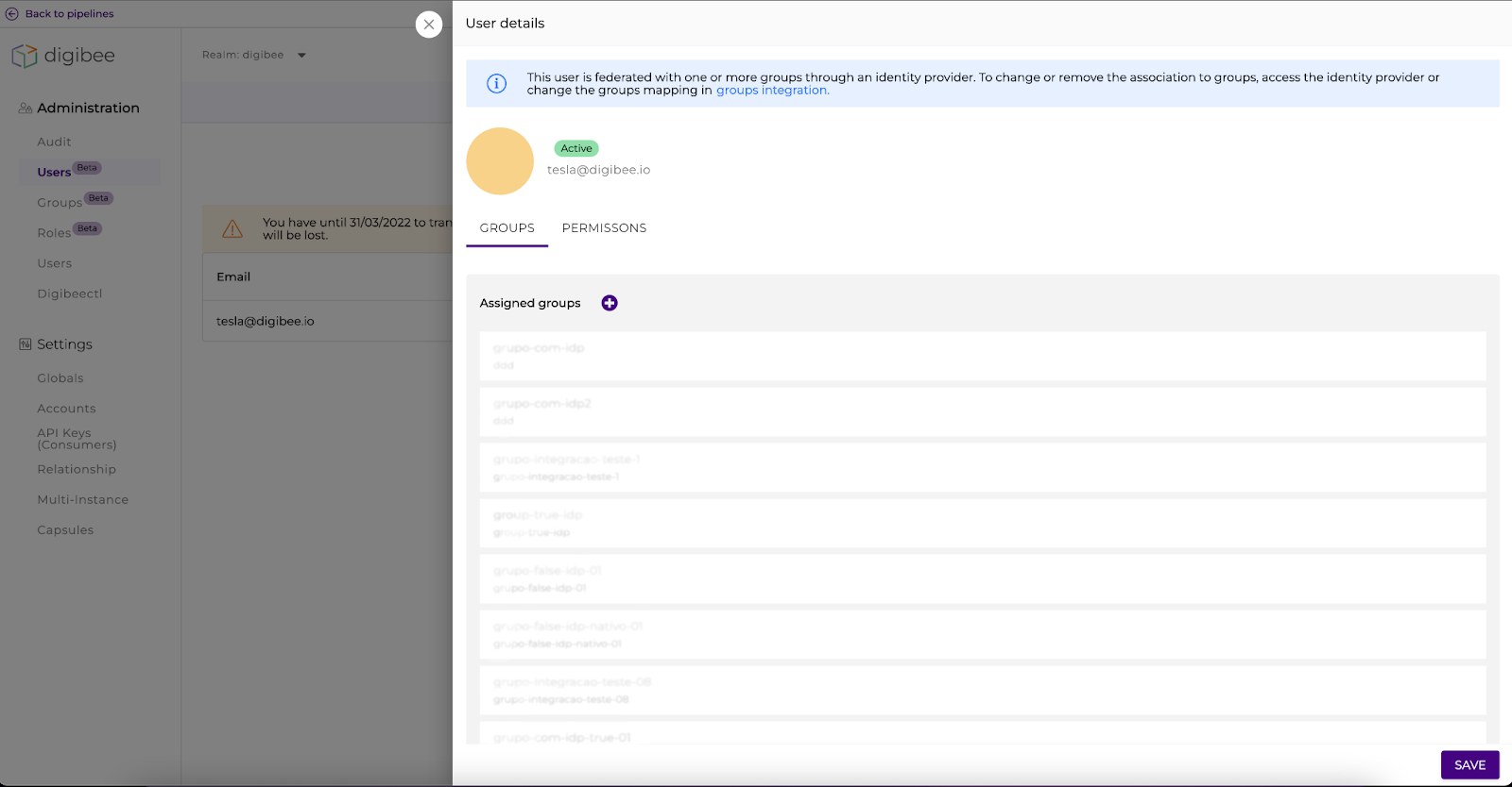 Now it’s no longer possible to assign users to integrated groups through the Digibee Integration Platform interface. If the access manager tries to make any changes, a warning is displayed on the group and user details page, informing that the integrations have already been made and edits must be made through the identity provider or on the Groups Integration page. Check out the alerts: