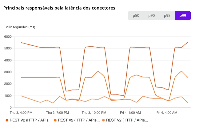 A Latência de Conectores é um novo gráfico disponível na página Pipeline Metrics em Monitor. Ele exibe a latência de conector, destacando os seis principais com a latência mais alta em um intervalo de tempo selecionado. Esta visualização ajuda você a identificar rapidamente tendências de desempenho e detectar mudanças no comportamento do conector de forma mais eficiente.