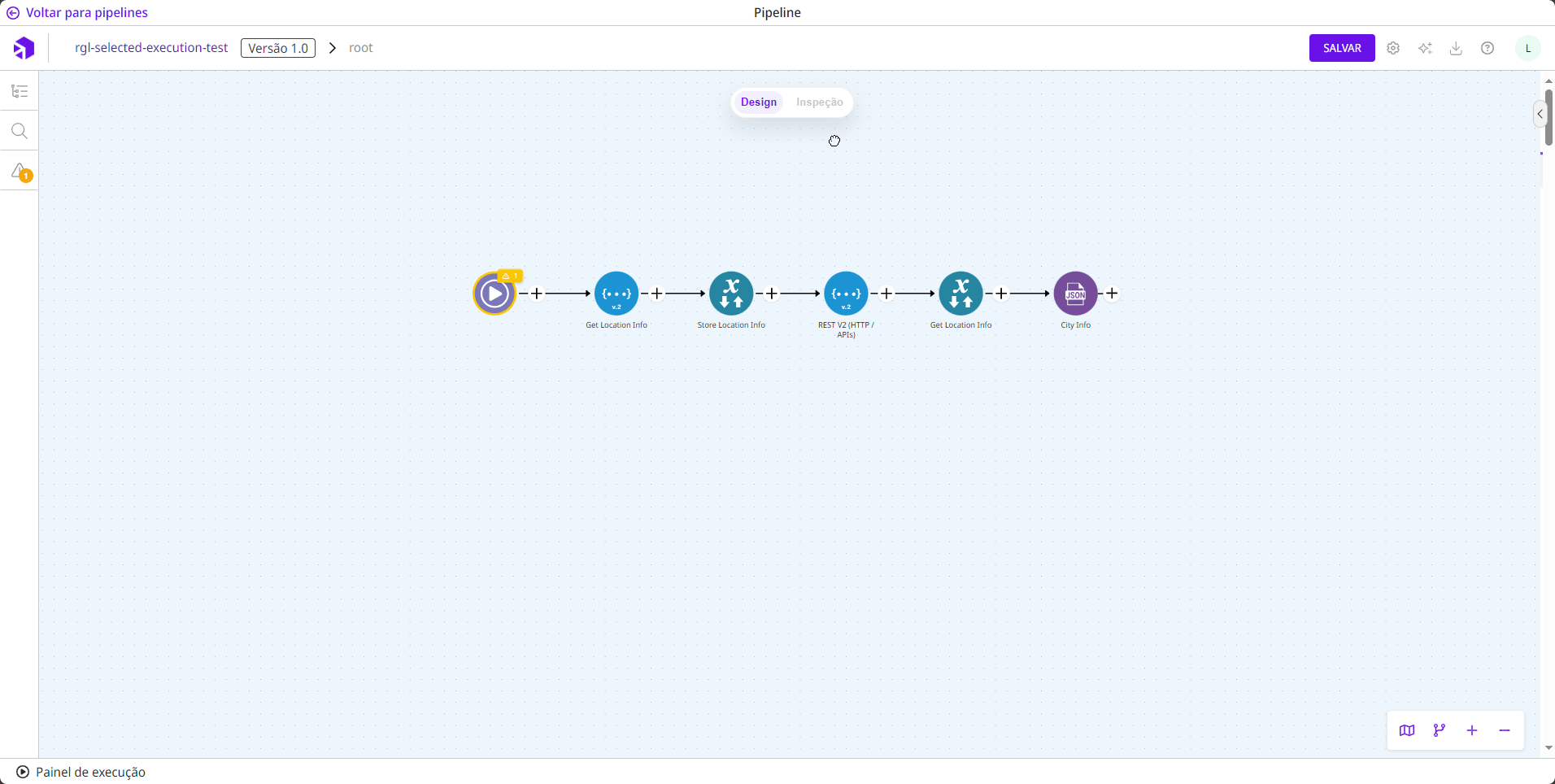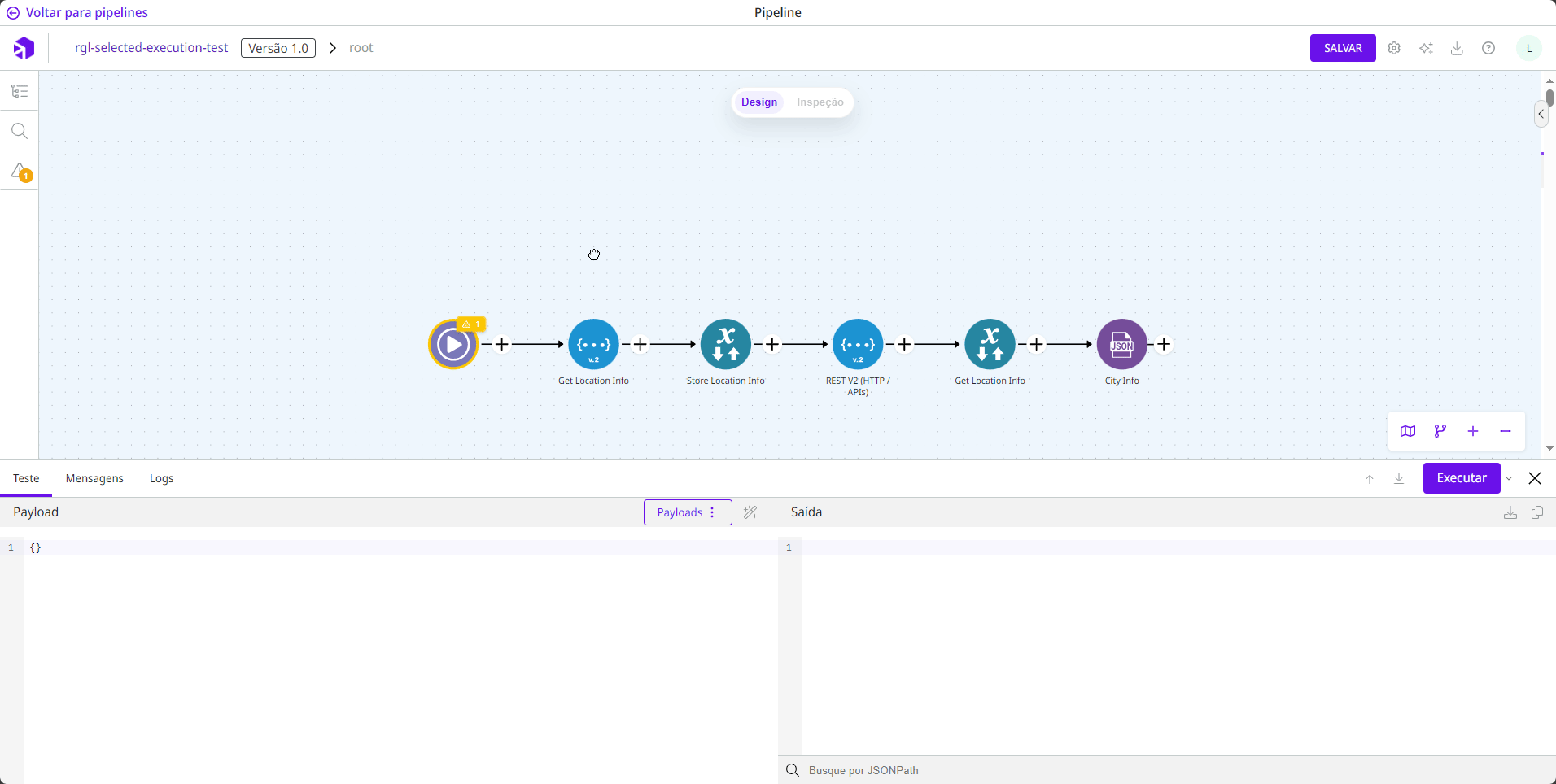 **Execução de Passos Selecionados** é uma nova funcionalidade que permite testar não apenas o fluxo inteiro, mas também segmentos específicos de um pipeline ou fluxo de cápsula. Ao selecionar quais etapas executar, você pode focar na validação de partes menores das suas integrações, sem precisar alterar a lógica do fluxo ou desconectar outros conectores.&#x20;
