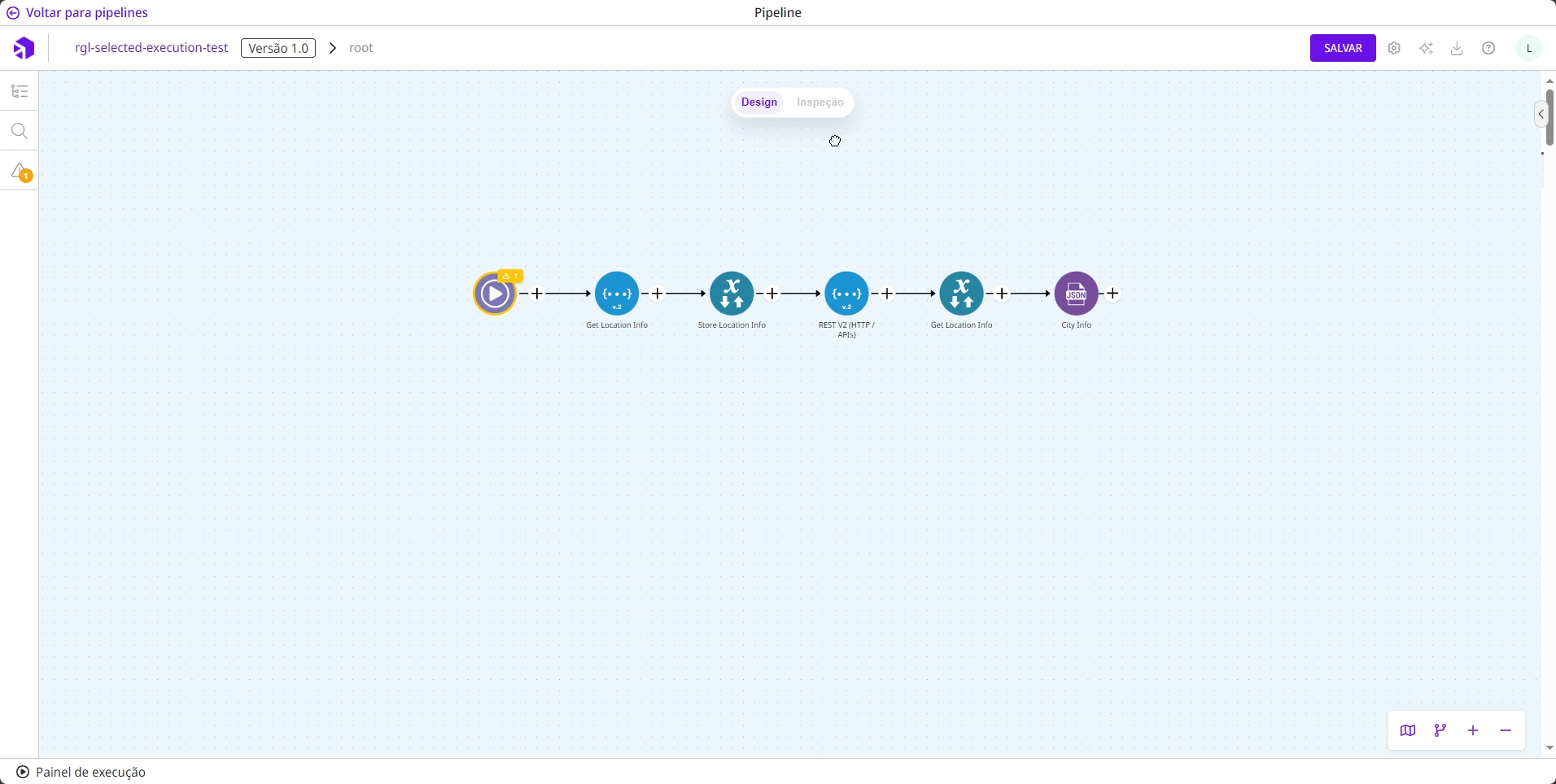 Execução de Passos Selecionados é uma nova funcionalidade que permite testar não apenas o fluxo inteiro, mas também segmentos específicos de um pipeline ou fluxo de cápsula. Ao selecionar quais etapas executar, você pode focar na validação de partes menores das suas integrações, sem precisar alterar a lógica do fluxo ou desconectar outros conectores.
