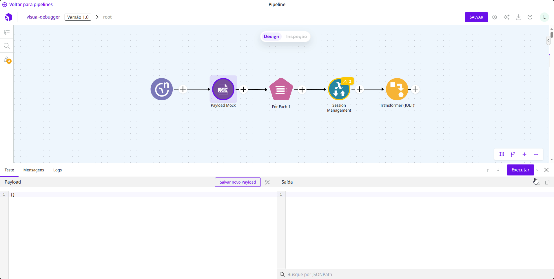 Além de executar todo o fluxo ou conectores selecionados, agora você pode **iniciar a execução de um pipeline a partir de um passo específico**. Isso permite começar de qualquer passo escolhido, garantindo que todos os passos subsequentes do fluxo sejam executados. Essa melhoria torna o processo de teste ainda mais eficiente.