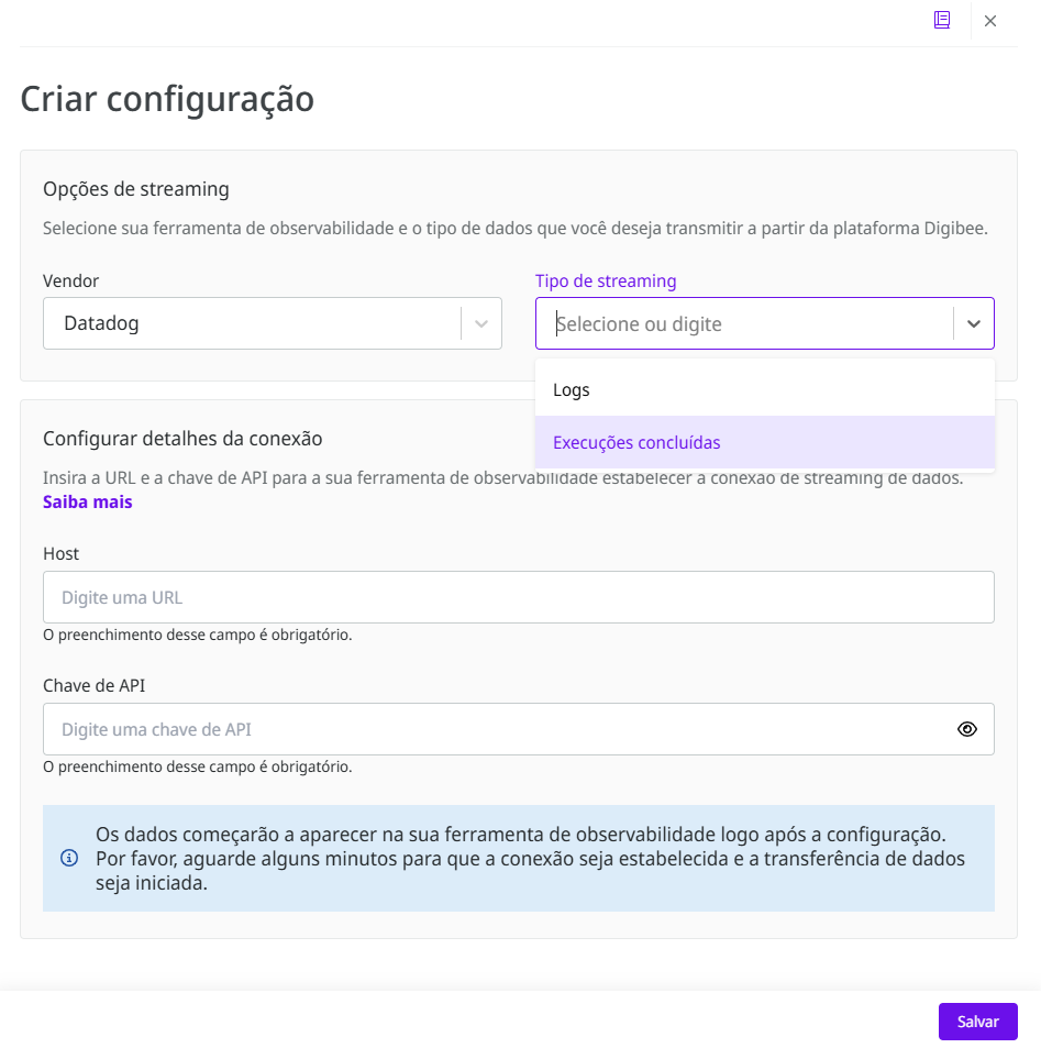 A funcionalidade de Transmissão de dados (anteriormente chamado de Transmissão de logs) agora permite transmitir automaticamente dados de logs e de execuções concluídas para ferramentas externas de sua preferência. Ganhe tempo otimizando suas análises e conectando dados entre sistemas. Confira a [documentação](https://app.gitbook.com/s/cO0A6g1dOsu8BiHYqO67/platform-administration/settings/data-streaming) e aprenda como [configurar a Transmissão de dados com o Datadog](https://app.gitbook.com/s/cO0A6g1dOsu8BiHYqO67/platform-administration/settings/data-streaming/how-to).