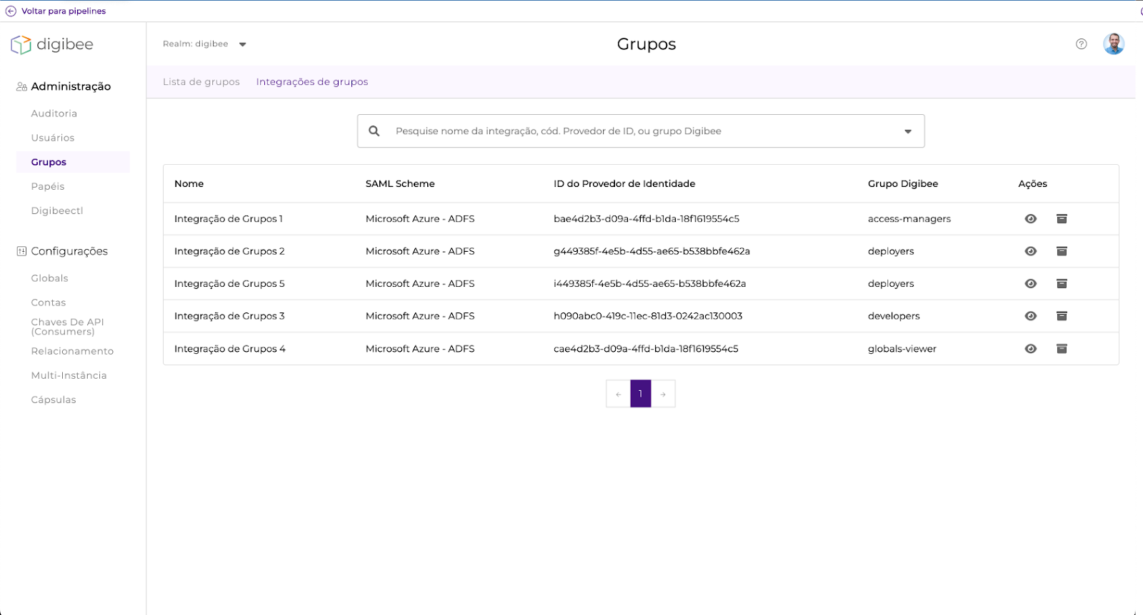 Criamos uma funcionalidade que permite que um usuário com permissão de apenas leitura tenha acesso à visualização de detalhes na página de Integrações de Grupos ao clicar no ícone de olho.