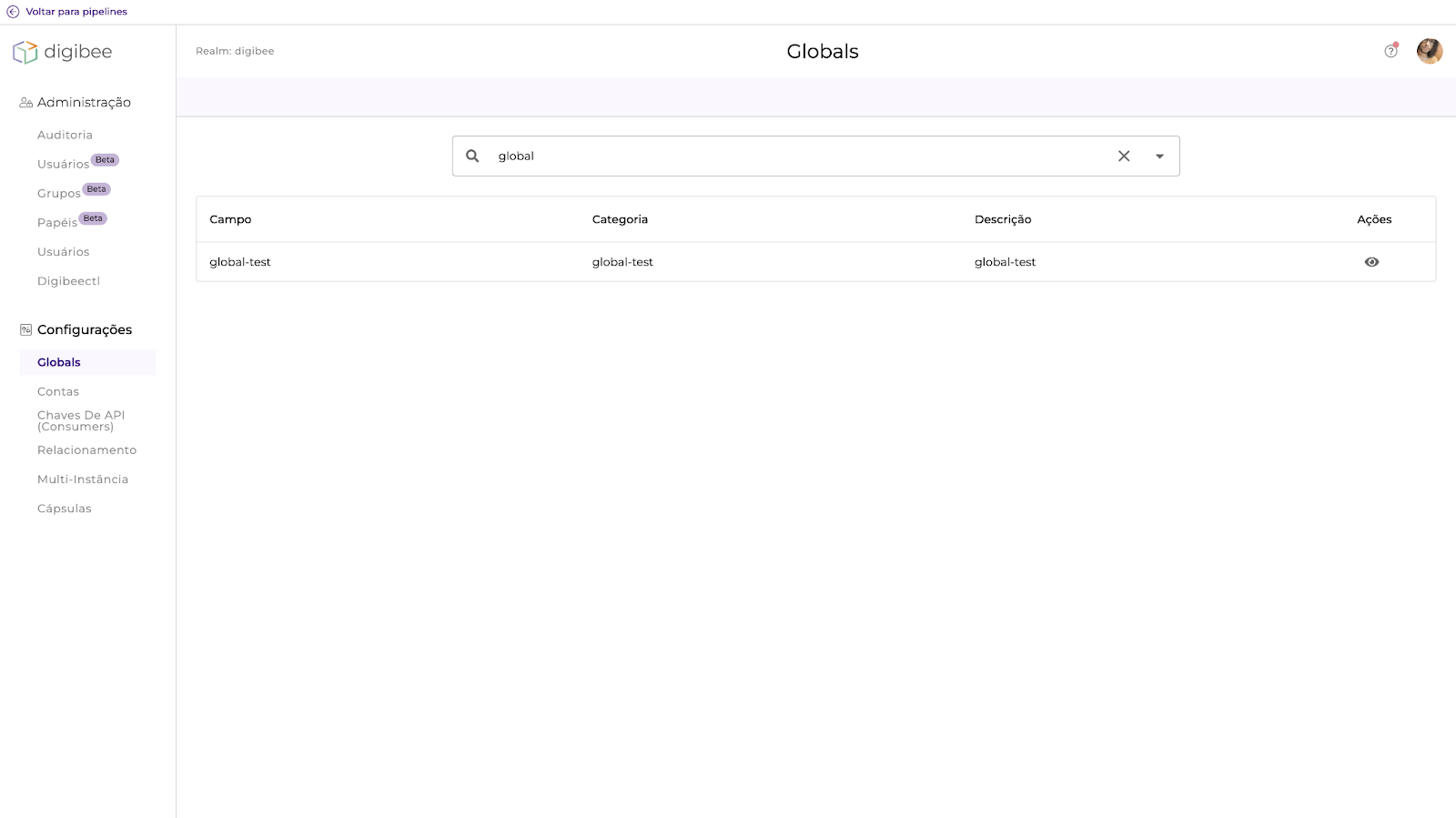 Criamos uma funcionalidade que permite que um usuário com permissão de apenas leitura tenha acesso à visualização de detalhes na página de Globals ao clicar no ícone de olho.