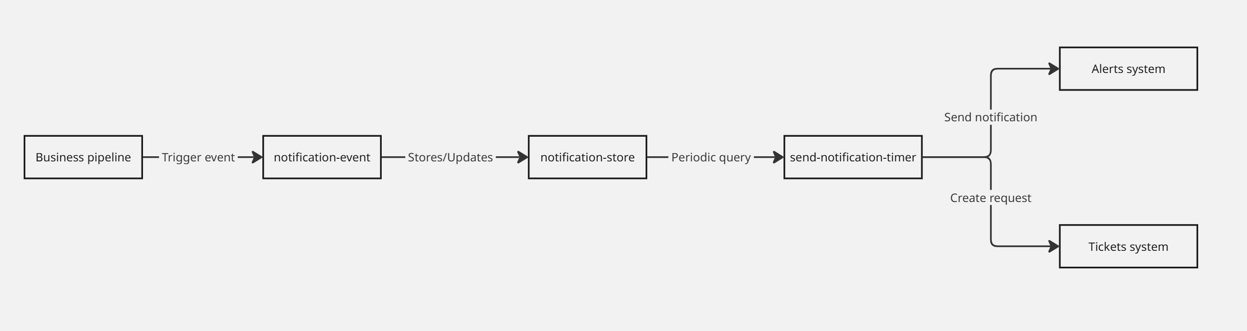 3. **Processing and sending the notification**: A second pipeline, `send-notification-timer`, periodically consults the records stored in the `notification-store` and sends notifications based on established rules.