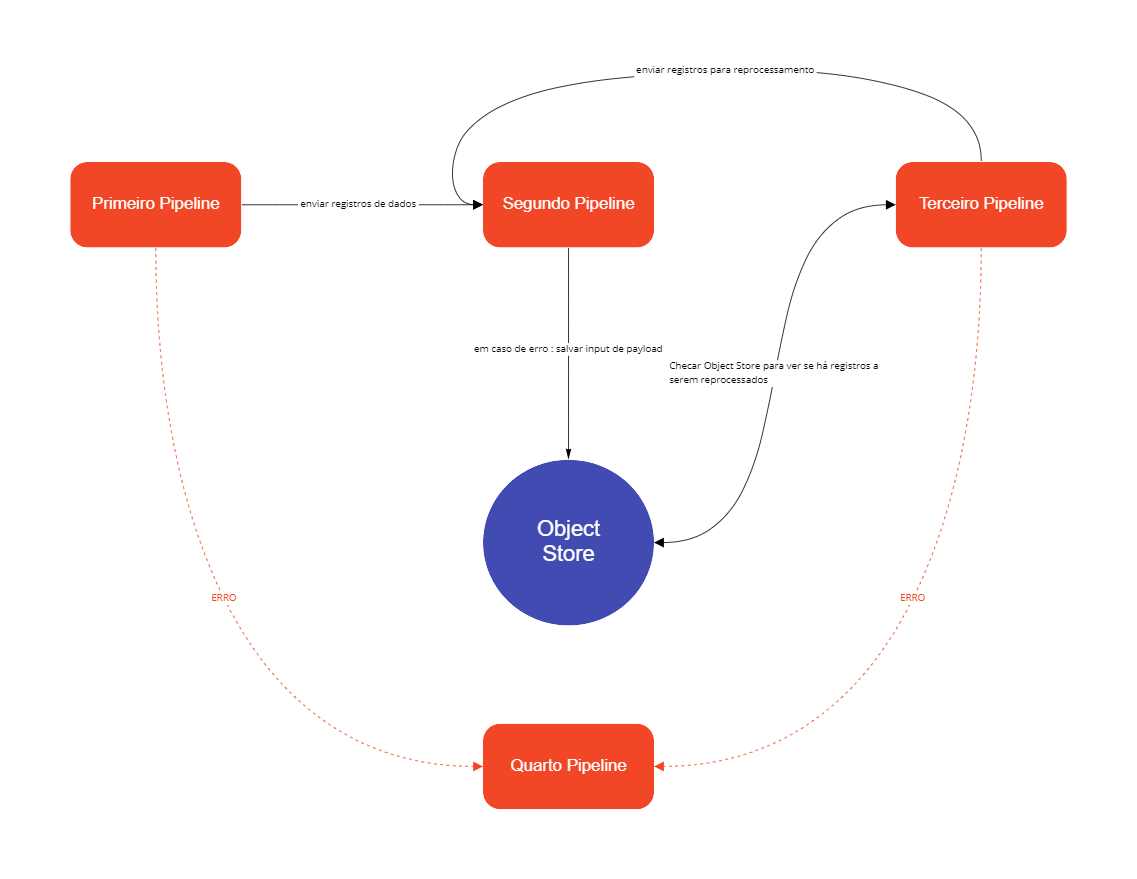 **O terceiro pipeline** periodicamente acessa o Object Store mencionado anteriormente e busca registros de erros. Depois, ele checa quantas tentativas de reprocessamento já foram feitas para um determinado registro. Se o número de tentativas ainda não alcançou um limite definido anteriormente, o *pipeline* publica um evento de reprocessamento que será recebido pelo segundo *pipeline*. Se o número de tentativas de reprocessamento atingir o limite ou se um erro acontecer durante a execução desse *pipeline*, ele publica um evento de erro.