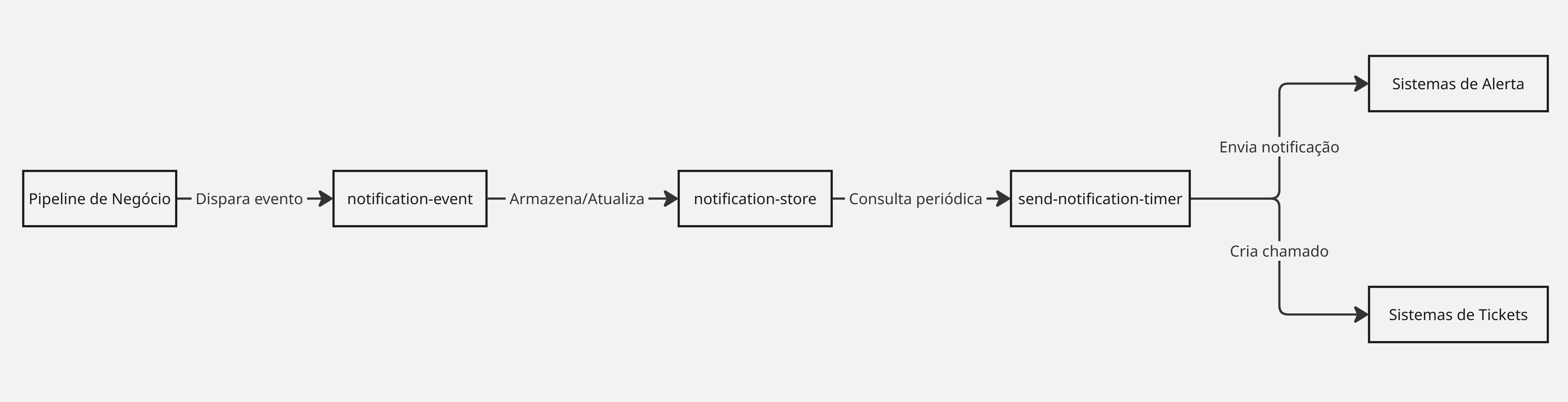 3. **Processamento e envio da notificação**: Um segundo pipeline, `send-notification-timer`, consulta periodicamente os registros armazenados no `notification-store` e realiza o envio das notificações com base nas regras estabelecidas.