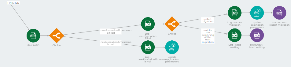 Se o parâmetro next execution timestamp existe, o pipeline verifica se é hora de iniciar o processo de migração de dados ou se ele deve continuar esperando. Se for a hora de iniciar o processo, atribuímos o valor EXTRACTING_DATA à propriedade step, o que faz com que o fluxo siga o caminho EXTRACTING_DATA na próxima execução.