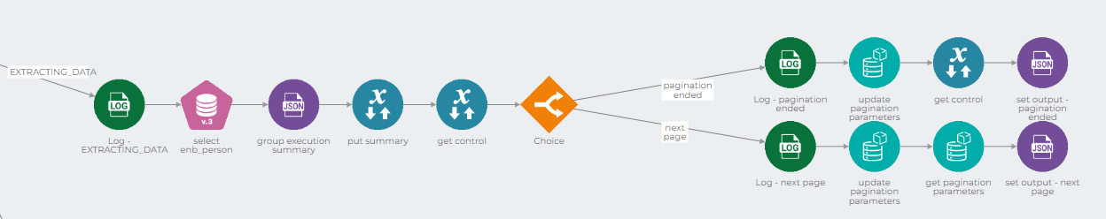 Nesse caminho, o fluxo envia cada registro para um pipeline de processamento de dados, cria um resumo da execução e atualiza os parâmetros da paginação a depender de em qual parte da migração o processo se encontra.