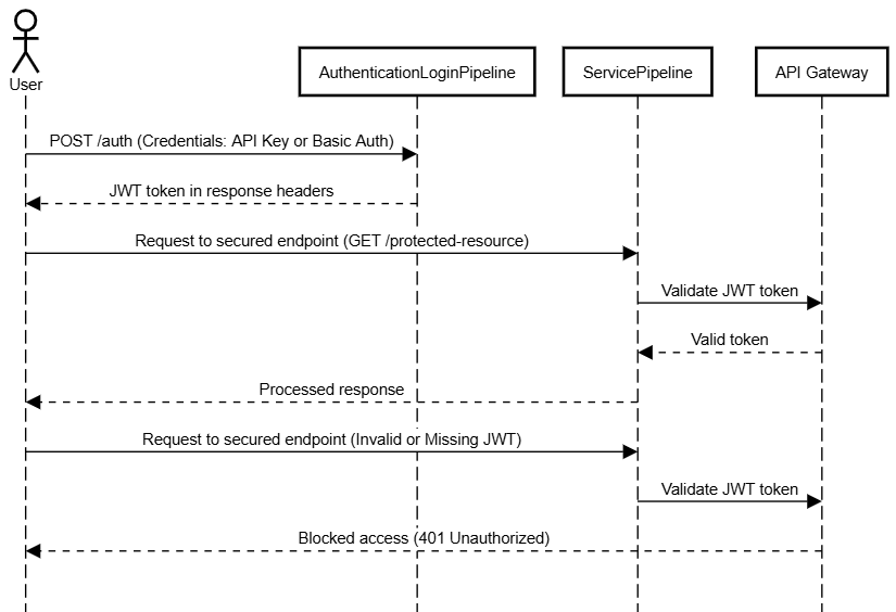 O processo começa quando o usuário envia uma **solicitação POST** para `/auth` no **AuthenticationLoginPipeline** com suas credenciais (**API Key** ou **Basic Auth**).&#x20;