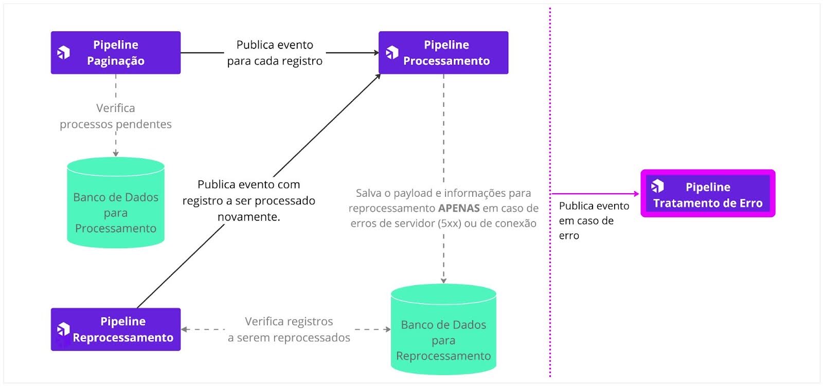 * **Não reprocessáveis (lado do cliente):** Ocasionados por payloads malformados ou dados obrigatórios ausentes. Esses erros são publicados no pipeline de tratamento de erros, onde são registrados e processados conforme necessário.