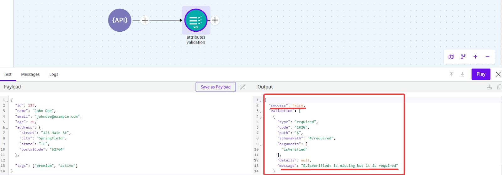 A ilustração acima mostra uma resposta de erro do conector Validator V2, acionada quando o payload não atende aos critérios de verificação dos atributos exigidos.
