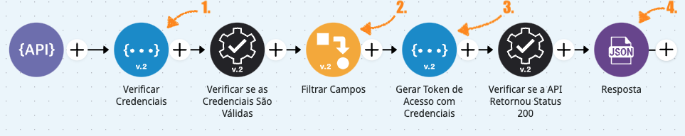 1. **Validação de credenciais:** O usuário envia `client_id`, `client_secret` e a chave de API. Um conector [**Assert**](https://app.gitbook.com/s/SKBJ6ZiEWBU93x170HH4/connectors/tools/assert-v2) verifica o payload, retornando um erro `401 Unauthorized` caso a validação falhe.