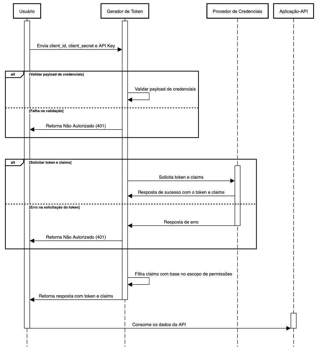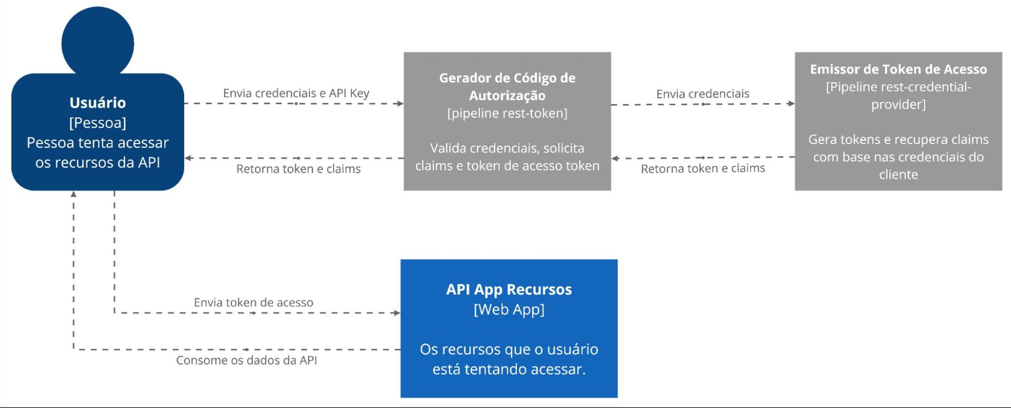 <figure><img src="https://content.gitbook.com/content/XfrDexGOLMin51pAiWkq/blobs/rqxr2HJqbyT9jKqEkzvt/image1.jpg" alt=""><figcaption><p>Diagrama: Diagrama C4 de alto nível mostrando a interação entre o usuário, o Gerador de Tokens, o Provedor de Credenciais e a API.</p></figcaption></figure>