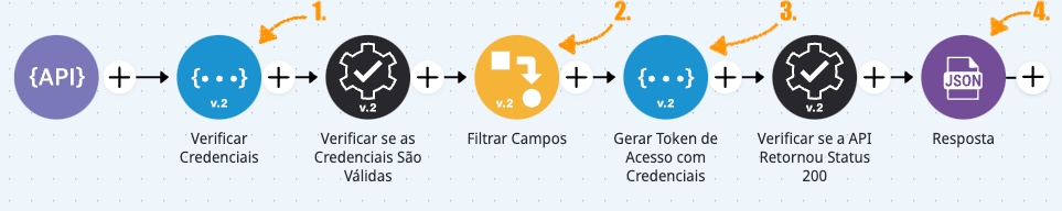 O diagrama abaixo ilustra o fluxo geral, desde o envio das credenciais até o acesso à API, demonstrando como o pipeline Gerador de Tokens protege as interações com a API: