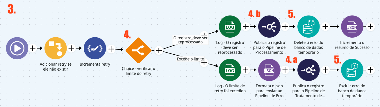Esse pipeline oferece uma solução para r**eprocessar eventos que falham na primeira tentativa** **de integração** porque ele repete automaticamente erros reprocessáveis por um **número configurado de tentativas**.